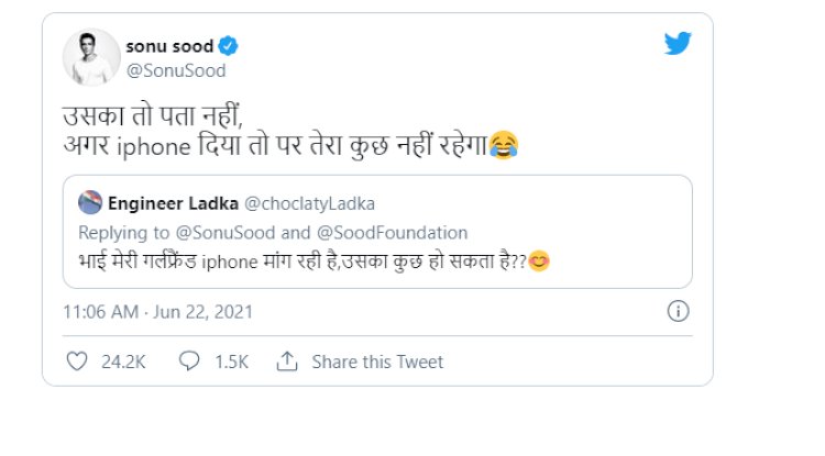 "My girlfriend is asking for an iPhone, can anything be done about it?" A Twitter user asked Sonu Sood while writing in Hindi on Twitter.
